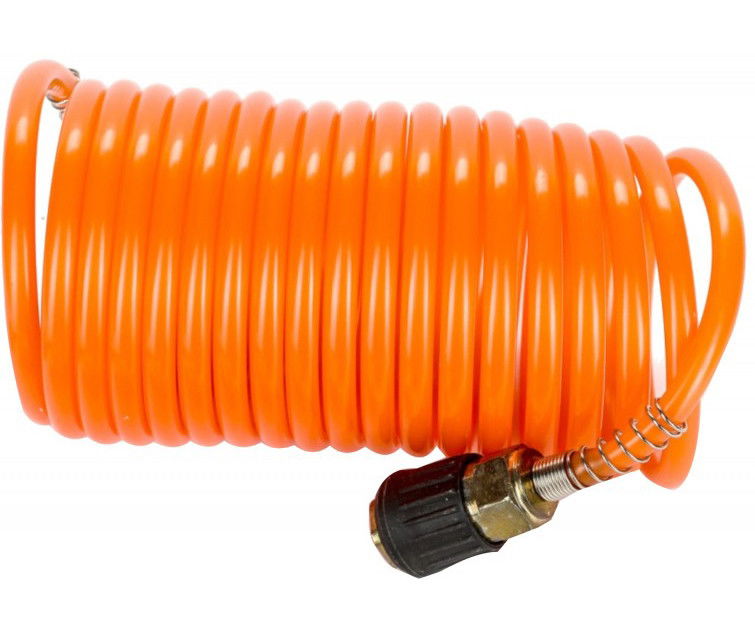Nylon alapanyagú, narancssárga színű spiráltömlő, gyorscsatlakozóval szerelve.